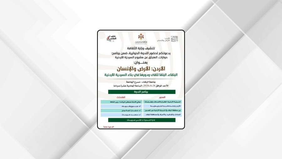 ندوة بعنوان "البلقا تلقى ودورها في بناء السردية الأردنية" الأحد المقبل