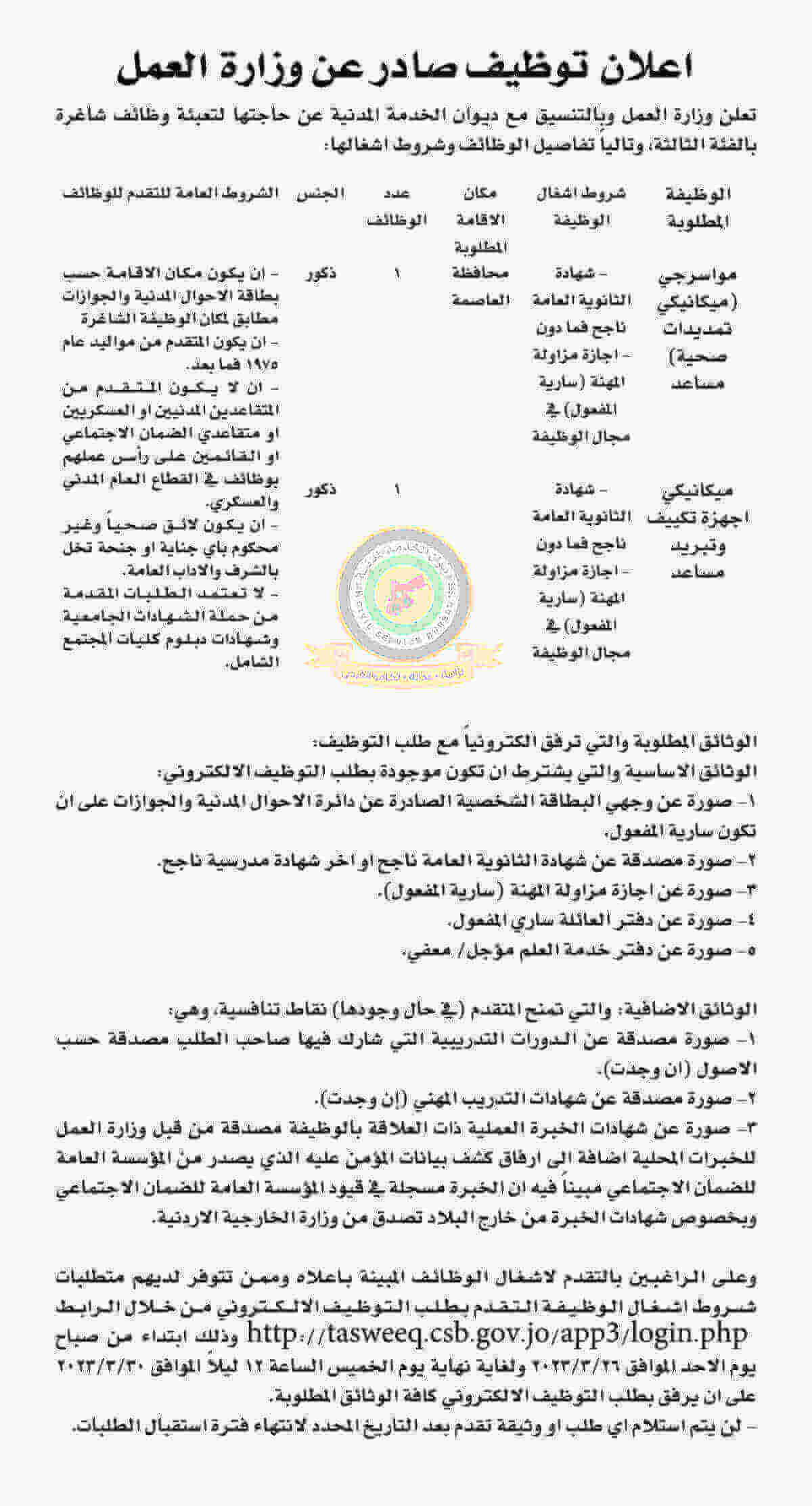 اعلان وظائف شاغرة بالفئة الثالثة صادرعن وزارة العمل