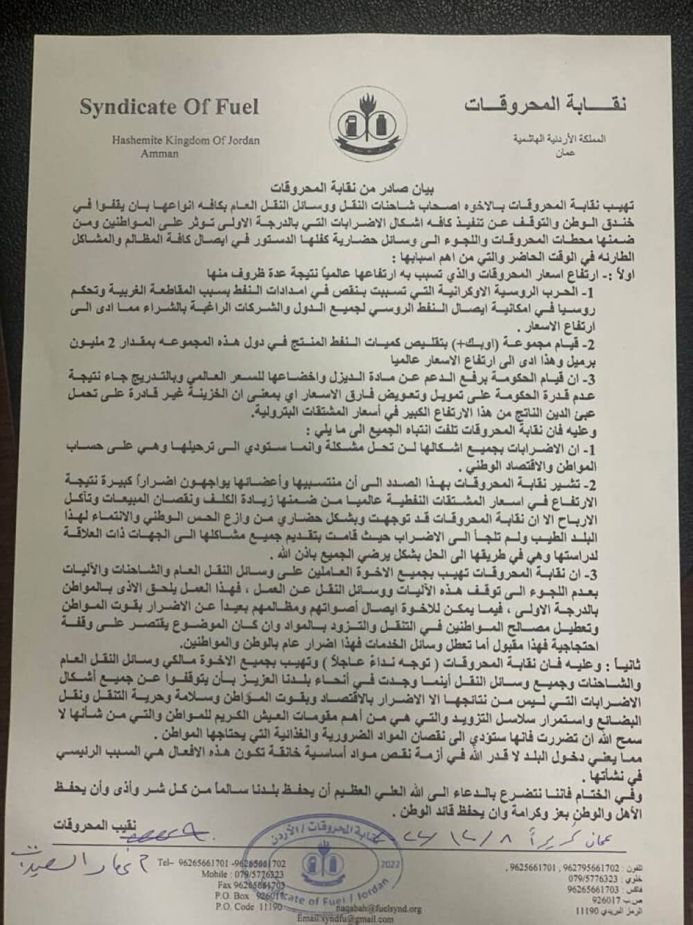 22الإعلامي- دعت نقابة المحروقات اصحاب شاحنات النقل ووسائل النقـل الـعـام بكافه انواعهـا للتوقف عن تنفيـذ كـافـه اشكال الاضرابات التـي تؤثر بالدرجة الاولى على المواطنين ومـن ضمنها محطات المحروقات.