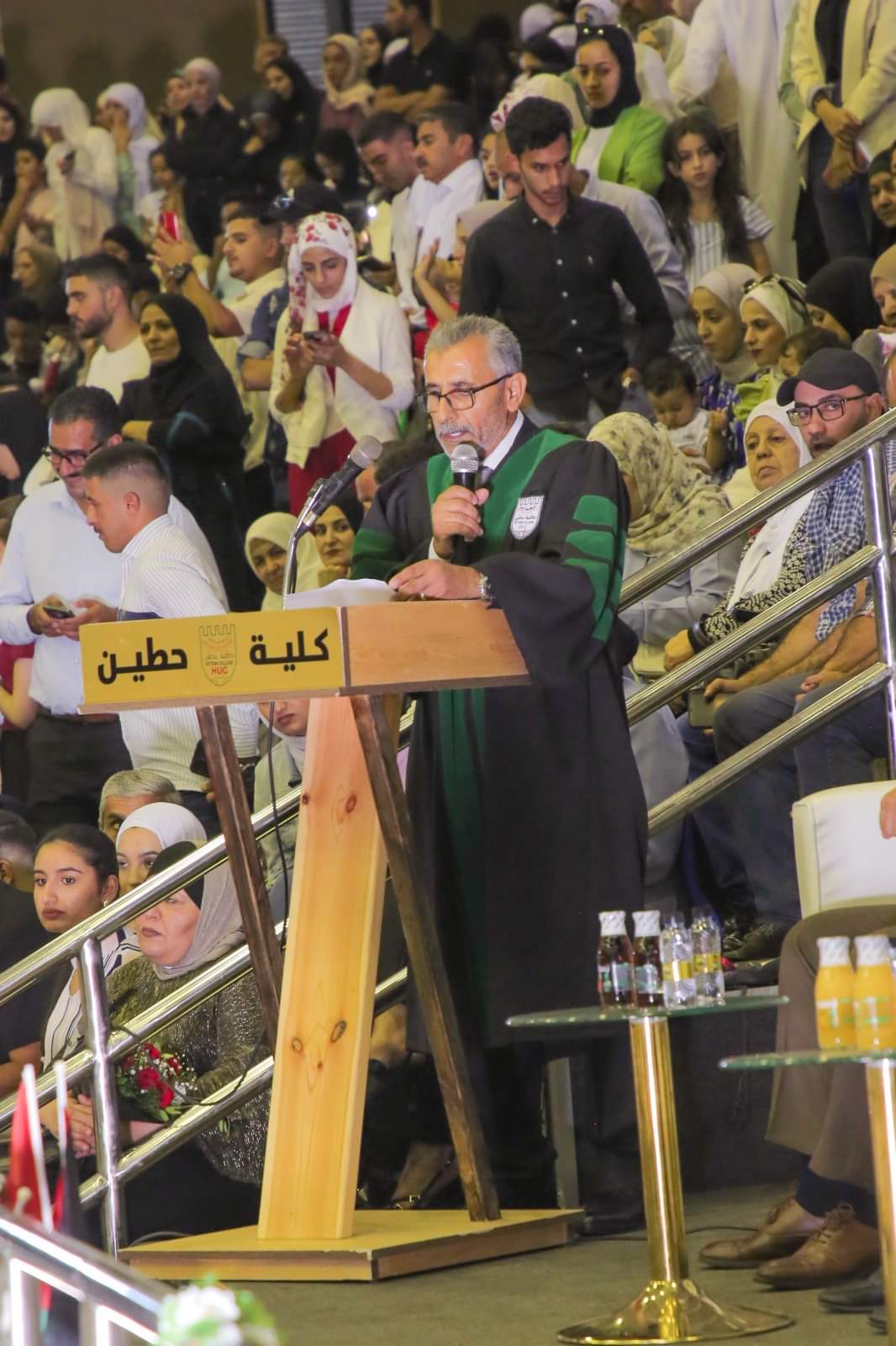 وفي كلمتة الترحبية عبر عميد كلية حطين الجامعية الدكتور موسى الحافظ عن فخره واعتزازة بتخريج هذة الكوكبة من طلبة كلية حطين الذين قدموا التضحيات الجسام خلال مسيرتهم التعليمية لتحقيق النجاح والتفوق ليكونوا جيل المستقبل القادر على حماية المكتسبات الوطنية الشاملة واستكمال مسيرة البناء والعطاء والإنجاز الوطني التي اختطها جلالة الملك عبدالله الثاني