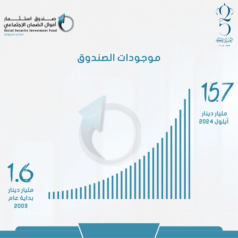 ونتيجة لتحقيق هذه الأرباح، إضافة الى تحويلات الفوائض التأمينية من المؤسسة العامة للضمان الاجتماعي والتي بلغت نحو 213 مليون دينار والأخذ بعين الاعتبار التقييم الدوري لمحفظة الأسهم الاستراتيجية، ارتفعت موجودات الصندوق بقيمة نحو 900 مليون دينار، لتصل الى 15.7 مليار دينار كما في نهاية 30/9/2024، مقارنة بـ 14.8 مليار دينار بداية هذا العام، وبنسبة نمو بلغت 6.1 بالمئة.