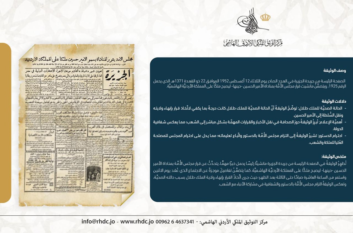 التوثيق الملكي يعرض وثيقة في ذكرى تنصيب الملك الحسين ملكًا
