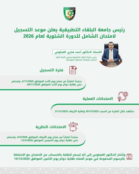 رئيس جامعة البلقاء التطبيقية يعلن موعد التسجيل لامتحان الشامل للدورة الشتوية لعام 2026