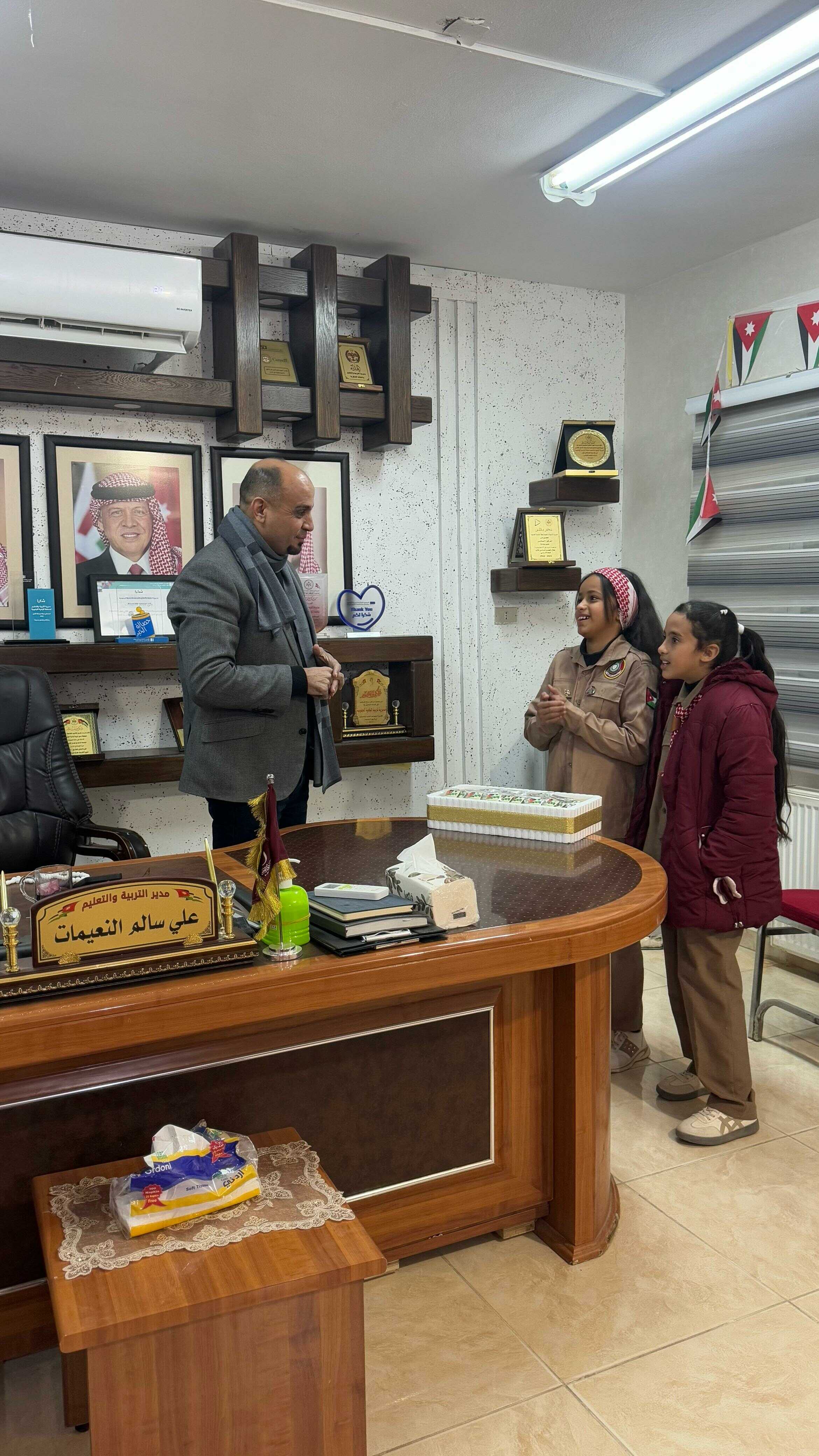 مدير تربية البادية الجنوبية يستقبل زهرات مدرسة أسماء بنت ابي بكر الأساسية المختلطة والمشاركة في الوقفة التضامنية لجلالة الملك حفظه الله لدعمه القضية الفلسطينية