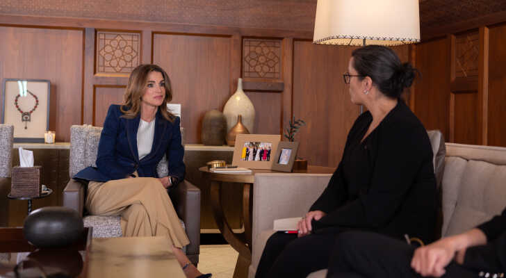 الملكة رانيا العبدالله تستمع من المدير التنفيذي لمنظمة إنقاذ الطفل لشرح حول أوضاع الأطفال في غزة