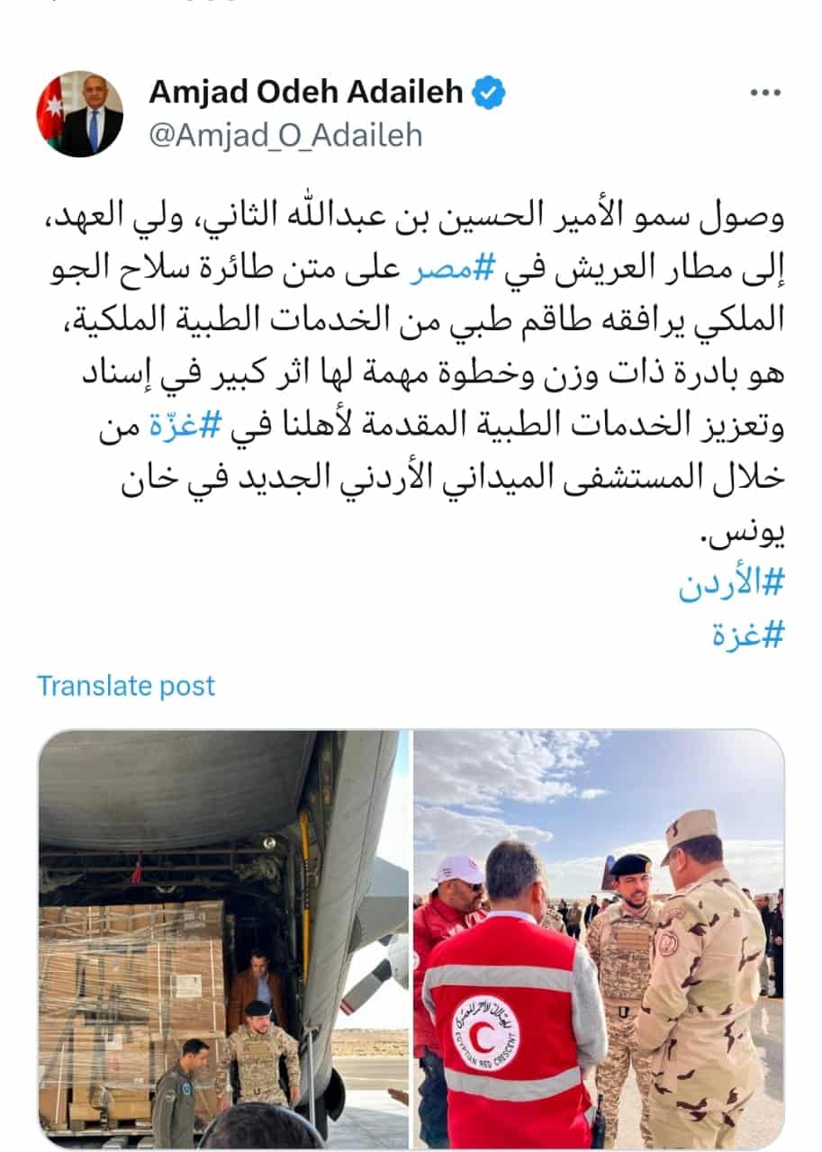حزب تقدُّم يُثمِّن مبادرة سمو الأمير الحسين بن عبدالله الثاني، ولي العهد، بالإشراف على تجهيز مستشفى ميداني ثانٍ بغزة