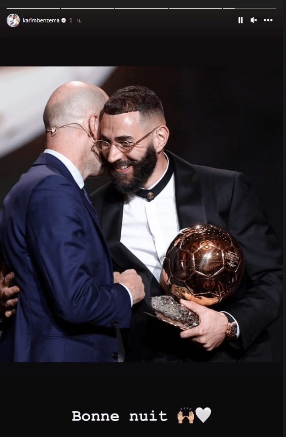وعاد بنزيما للرد للمرة الثانية على ديشامب، بعد أن نشر صورة له مع زين الدين زيدان، المدير الفني السابق لريال مدريد، أثناء استلام الكرة الذهبية، وكتب عليها: "ليلة سعيدة".