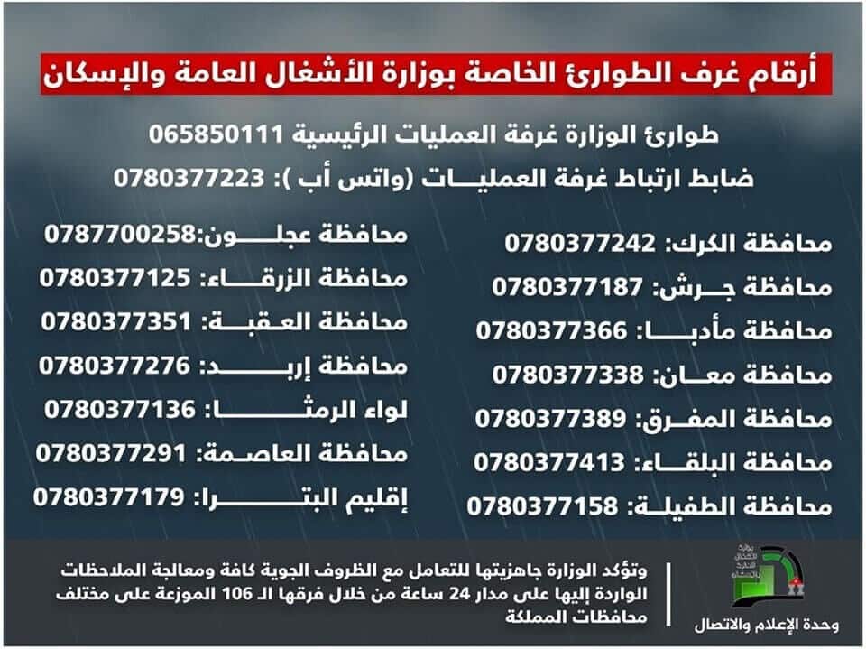 كما دعت إلى عدم التردد بالإبلاغ عن أي حالة طارئة من خلال التواصل المباشر مع غرفة العمليات الرئيسية في الوزارة وغرف العمليات في المحافظات، أو من خلال تطبيق نظام بلاغات الأشغال على الهواتف الذكية أو من خلال غرف عملياتها على الأرقام التالية: