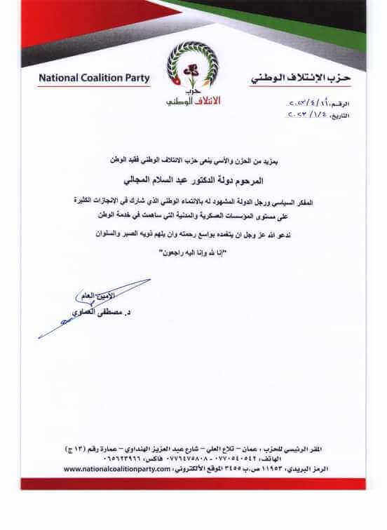حزب الائتلاف الوطني ينعى دولة الدكتور عبد السلام المجالي