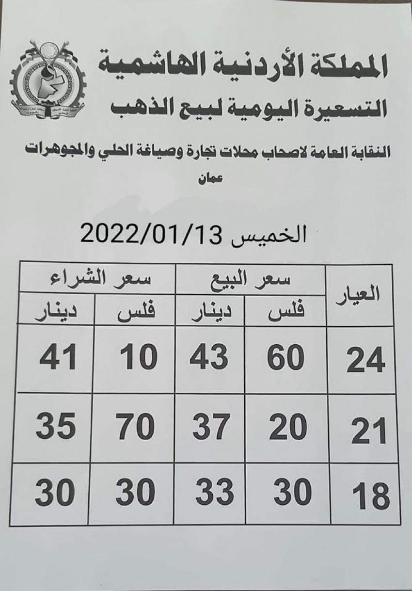 وكما استقر سعر الغرام من عيار 24 قيراط عند 43 دينارا و 60 قرشا، كما بلغ سعر شراء عيار 18 عند 33 دينارا و 30 قرشا لغايات الشراء المواطنين.