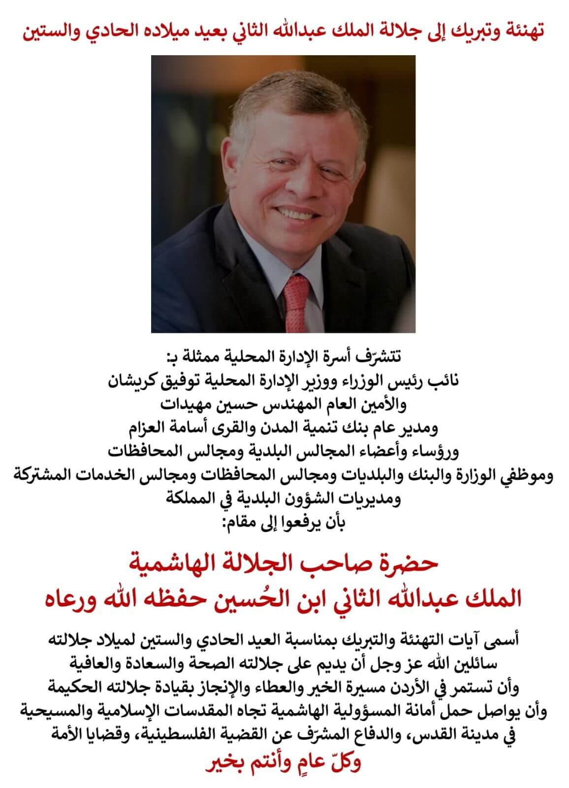 تتقدم اسرة الادارة المحلية بأطيب التهاني لجلالة الملك عبد الله الثاني في عيد ميلاده الحادي والستين