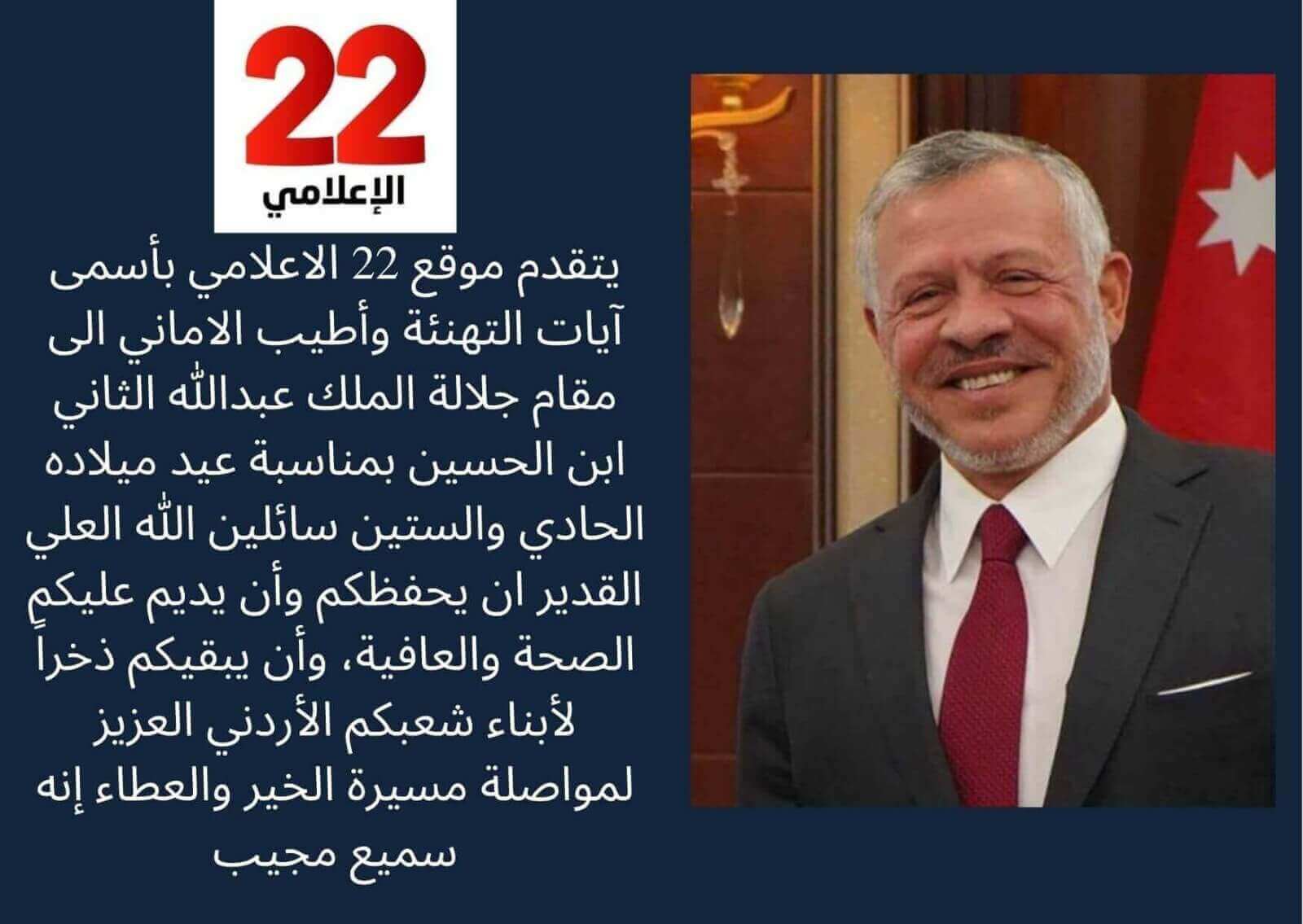 22 الاعلامي - تتشرف أسرة موقع 22 الاعلامي بأن يرفعوا أسمى آيات التهاني والتبريكات إلى مقام حضرة صاحب الجلالة الملك عبدالله الثاني ابن الحسين المعظم بمناسبة عيد ميلاد جلالته الحادي والستين سائلين الله العلي القدير أن يحفظ جلالته ويمده بموفور الصحة والعافية، وأن يديم على الوطن الغالي نعمة القيادة الهاشمية الرشيدة.