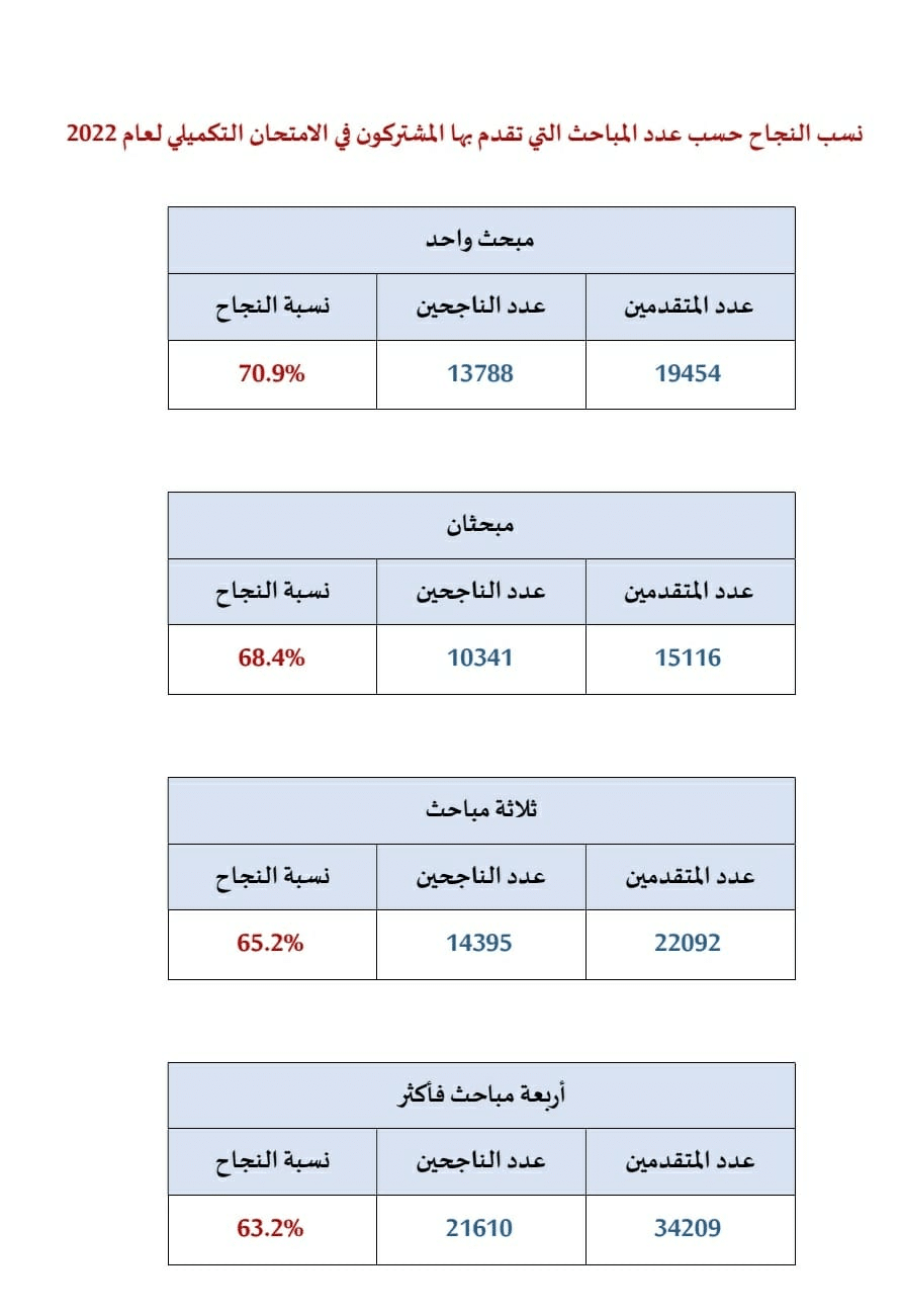 وبينت الوزارة، في بيان صحفي اليوم الخميس، أن نسب النجاح العامة في الامتحان بلغت 66.9 بالمئة في المسار الثانوي الشامل الأكاديمي، و61.5 بالمئة في المسار الثانوي الشامل المهني، حيث بلغ عدد الذين سجلوا للامتحان التكميلي لعام 2022 نحو 100198 منهم 85897 بغرض استكمال متطلبات النجاح و 14301 لأغراض رفع المعدل.