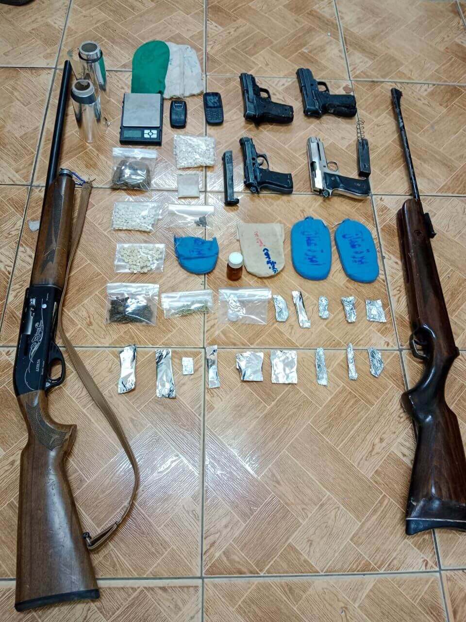 وفي احدى مناطق البادية الشمالية جرت مداهمة وتفتيش ثلاثة منازل لمروجين ومطلوبين بقضايا المخدرات والقي القبض عليهم الثلاثة داخل احد المنازل فيما جرى ضبط كميات متفرقة من المواد المخدرة المعدة والجاهزة للبيع اضافة الى اربعة اسلحة نارية.