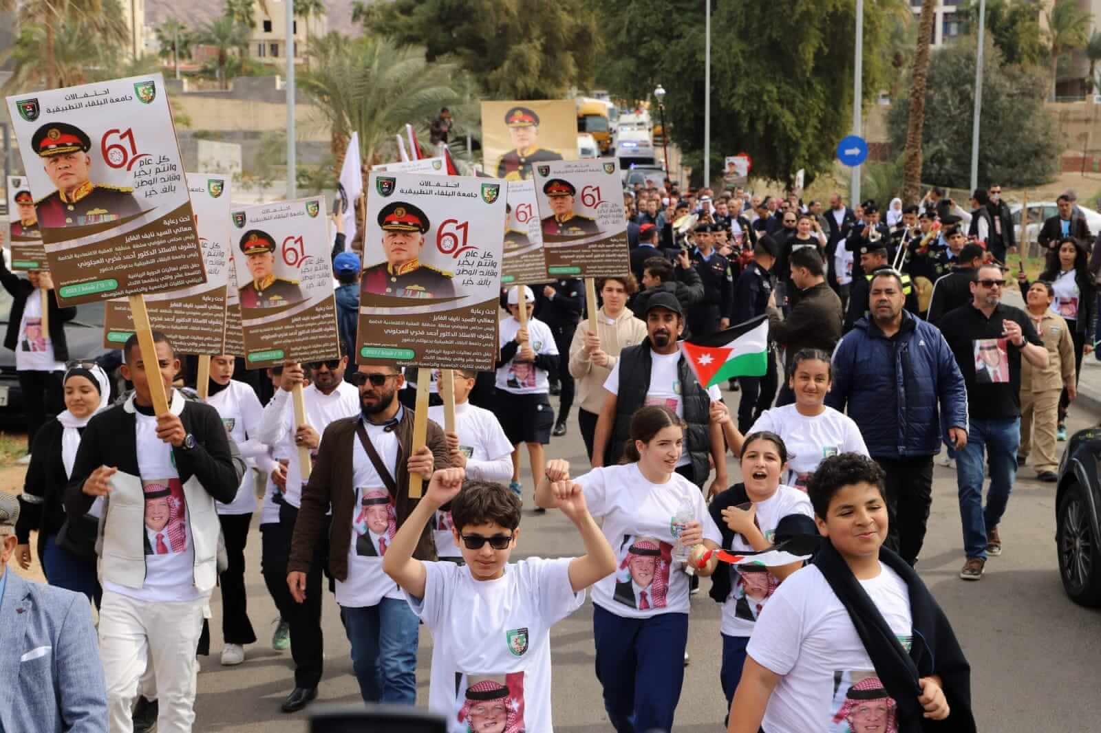 وقال محافظ العقبة السيد خالد الحجاج اننا اليوم نحتفل في هذه المسيرة التي نظمتها جامعة البلقاء التطبيقية في العقبة للتعبير عن الإخلاص والولاء للقيادة الهاشمية بمناسبة عيد ميلاد جلالة الملك عبدالله الثاني ابن الحسين المعظم.