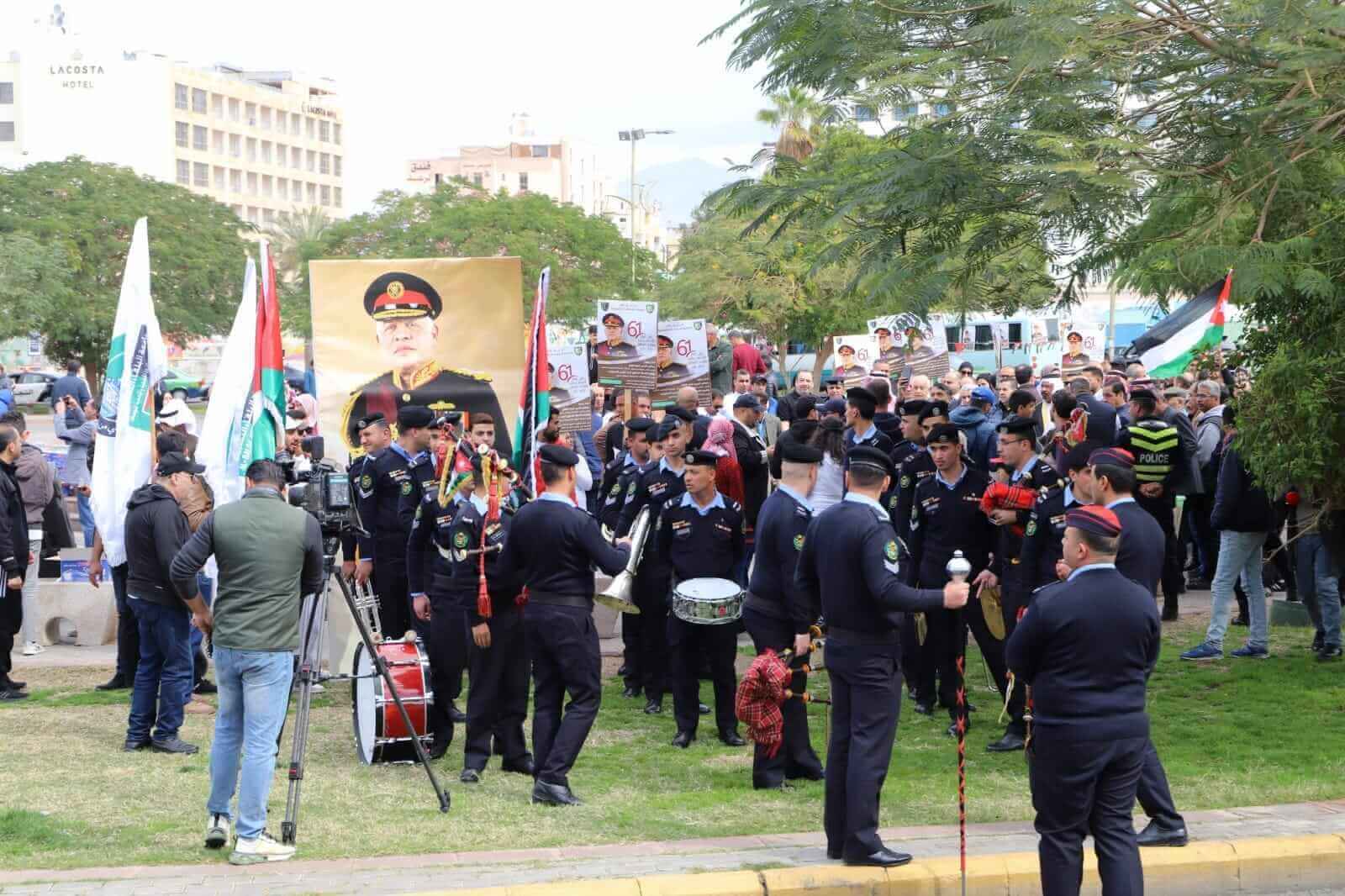 22 الاعلامي - رعى رئيس جامعة البلقاء التطبيقية الاستاذ الدكتور أحمد فخري العجلوني وبحضور محافظ العقبة عطوفة السيد خالد الحجاج، وعميد شؤون الطلبة الدكتور خالد الزعبي وعدد من مفوضي سلطة منطقة العقبة الاقتصادية الخاصة وبمشاركة مدراء الأجهزة الرسمية، و المؤسسات الاهلية في محافظة العقبة، المسيرة التي انطلقت من وسط مدينة العقبة إلى ساحة الثورة العربية الكبرى بمناسبة عيد ميلاد جلالة الملك عبدالله الثاني ابن الحسين المعظم، وشاركت فيها فرقة موسيقات مديرية الأمن العام.