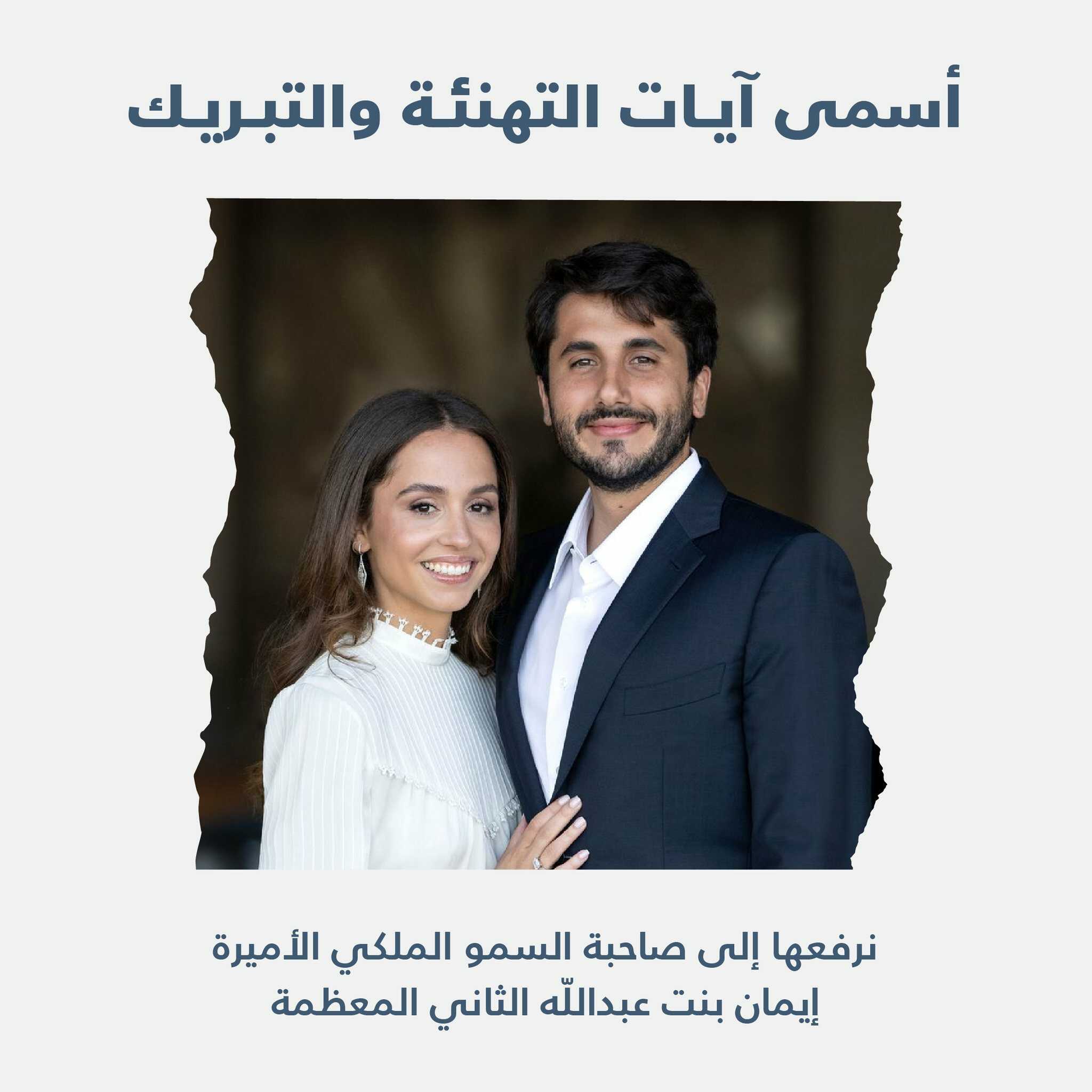 22 الاعلامي - شركة أمنية تهنئ صاحبي الجلالة الملك عبدالله الثاني ابن الحسين وجلالة الملكة رانيا العبدالله بمناسبة زفاف صاحبة السمو الملكي الأميرة إيمان بنت عبدالله الثاني والسيد جميل ألكساندر ترميوتس، وتتمنى لهما حياة مليئة بالسعادة والهناء.