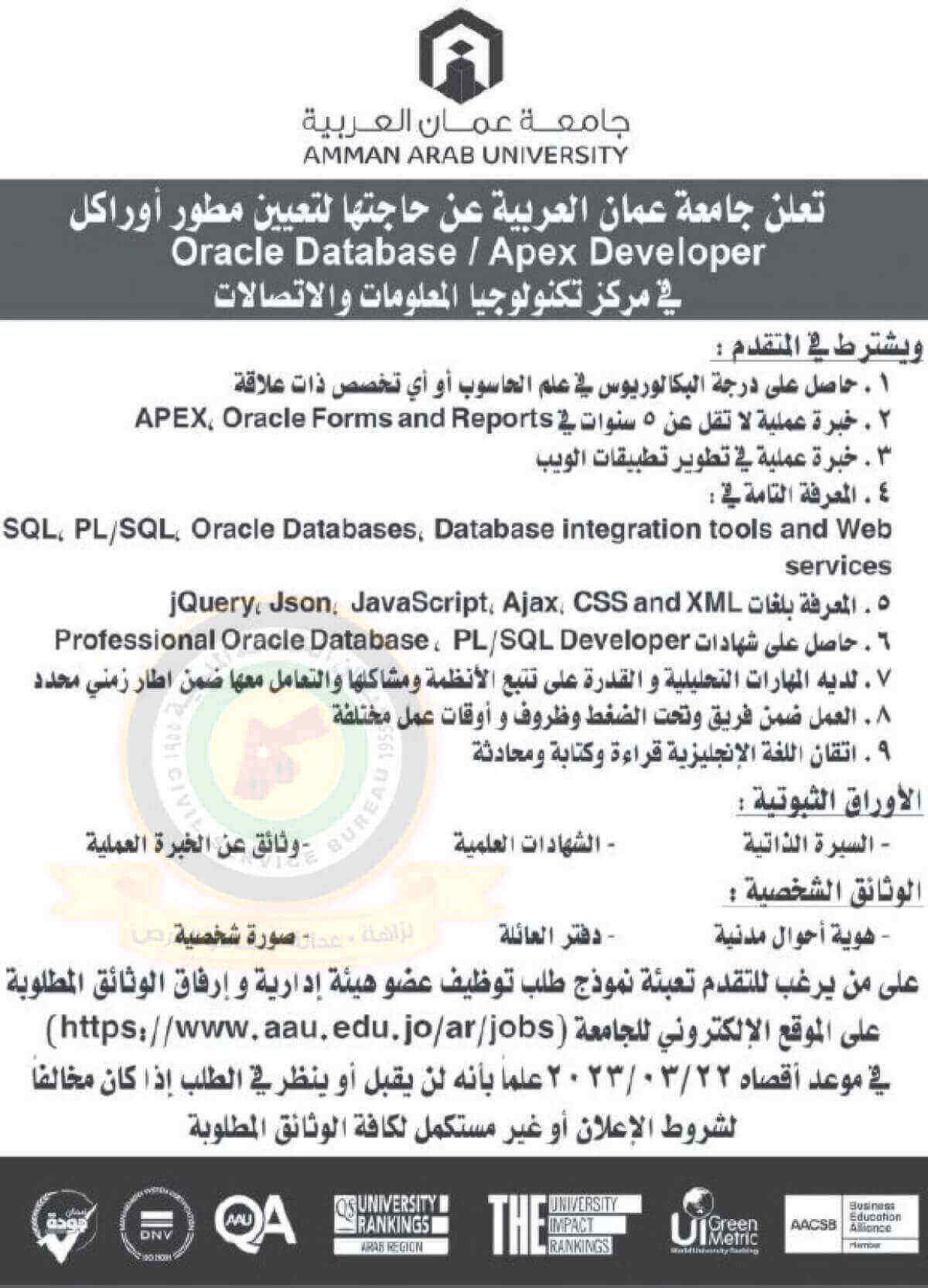 اعلان توفر شاغر مطور اوراكل صادر عن جامعة عمان العربية