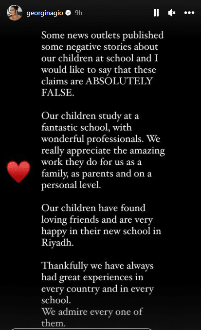 وقالت جورجينا رودريجز، فى بيان عبر حسابها على إنستجرام :"نشرت بعض المواقع أخبارًا سلبية عن أبنائنا، وأود التأكيد أن هذه الأخبار كاذبة بالكامل، أولادنا يدرسون في مدرسة رائعة مع احترافية كبيرة، نحن نقدر عملهم من أجلنا كعائلة وآباء، وعلى المستوى الشخصي".
