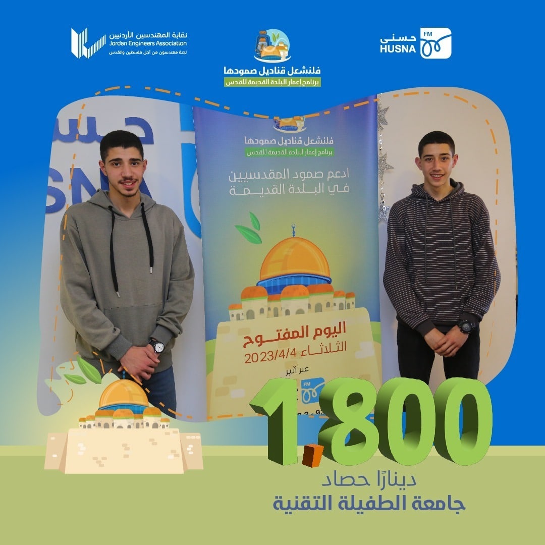 وقدم المهندس سمارة شكره وتقديره لكافة شرائح الشعب الاردني من طلبة واطفال ورجال اعمال وتجار وجامعات ومهندسين ومتطوعين، لما بذلوه من جهد وعطاء في دعم صمود اشقائهم المقدسيين وتثبيتهم على ارضهم، ودفاعا عن القدس وعروبتها وهويتها، كما تقدم بالشكر الى اذاعة حسنى اف ام التي عملت بكامل كوادرها ومقدمي برامجها جنبا الى جنب مع النقابة لانجاح ذلك الحدث الوطني.