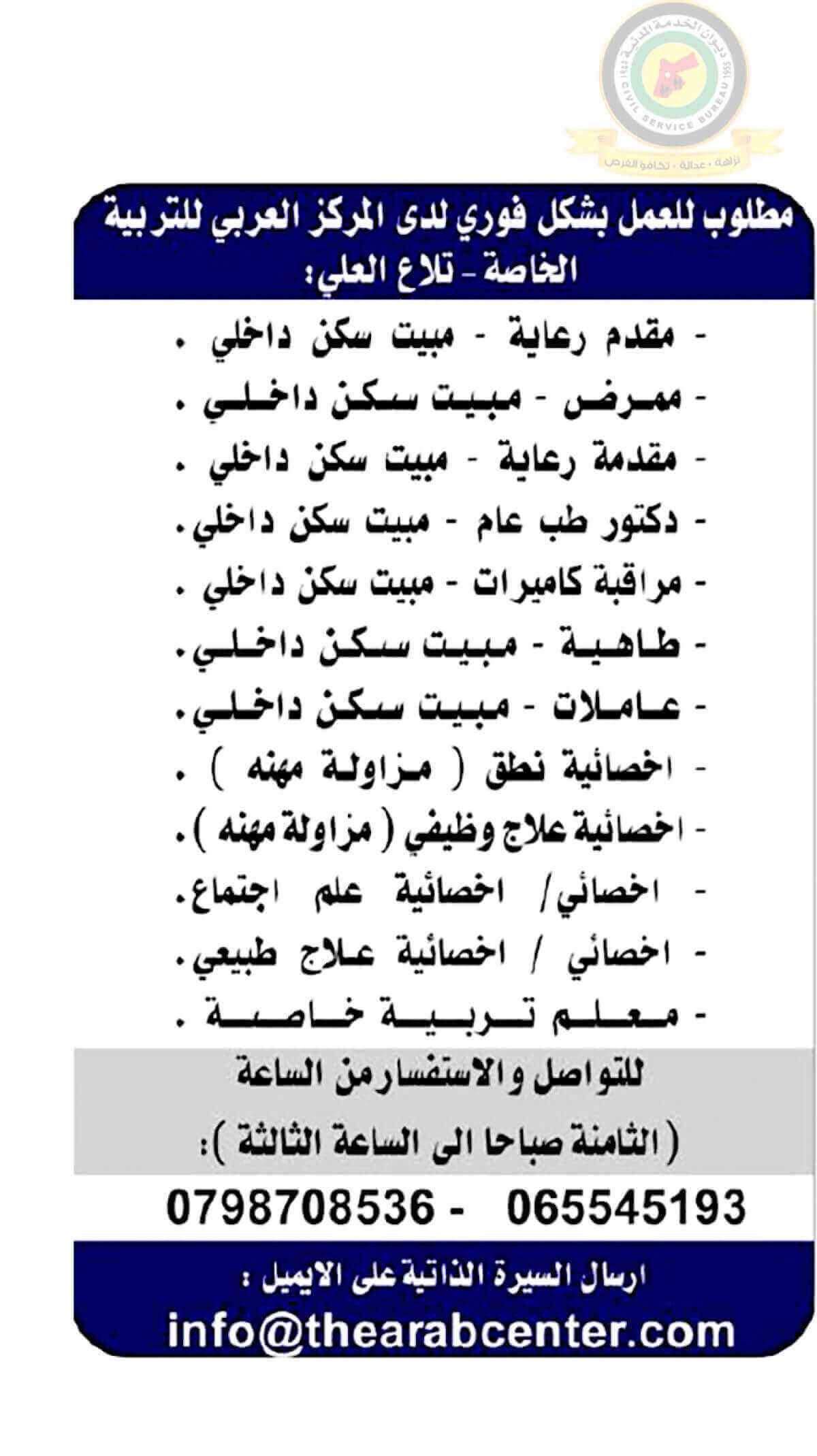 اعلان وظائف شاغرة صادرعن المركز العربي للتربية الخاصة