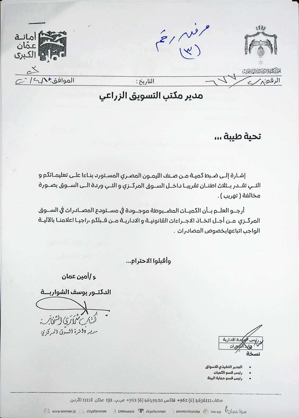 إن الكميات التي وردت بتاريخ 2023/4/8 من صنف الليمـون إلى السوق المركزي فـي عمـان والتابع لأمانة عمان الكبرى قد وردت على أنها صنف محلي من مناطق الأغوار الشمالية وليس مستورداً ـ مرفق رقم (1) بيان الشحن الخاص بورود هذا الصنف الى السوق المركزي.
