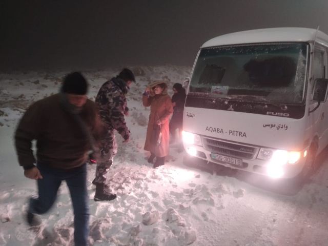 قال الناطق الإعلامي باسم مديرية الأمن العام أن كوادر الإنقاذ والإسعاف في مديرية دفاع مدني معان قامت بإخلاء ٦ مواطنين علقت الحافلة التي كانت تقلهم بسبب تراكم الثلوج في منطقة الطيبة - وادي موسى ، وتم نقلهم وتأمينهم وتقديم يد العون لهم