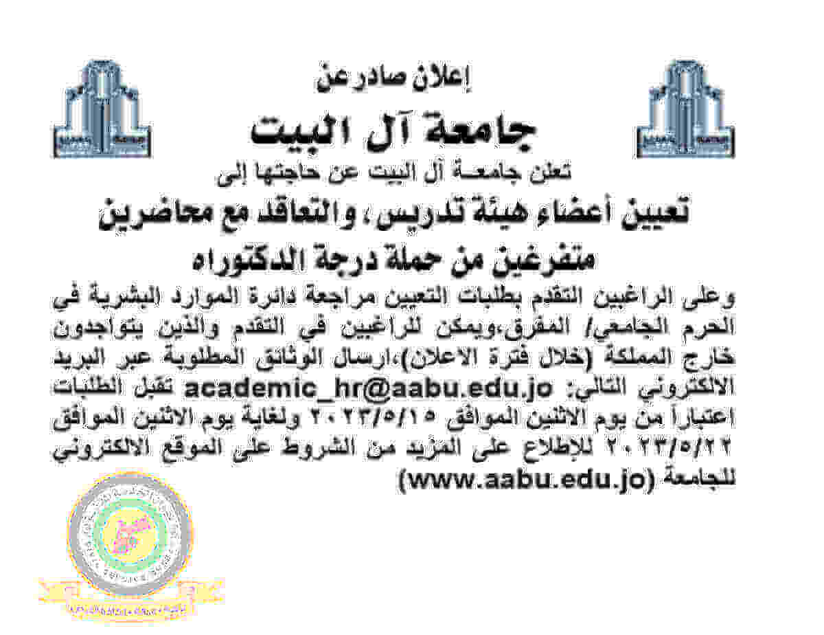 اعلان تعيين اعضاء هيئة تدريسية صادر عن جامعة آل البيت