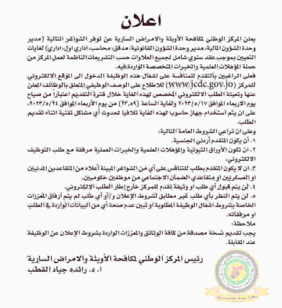 اعلان وظائف شاغرة صادرعن المركز الوطني لمكافحة الأوبئة والأمراض السارية