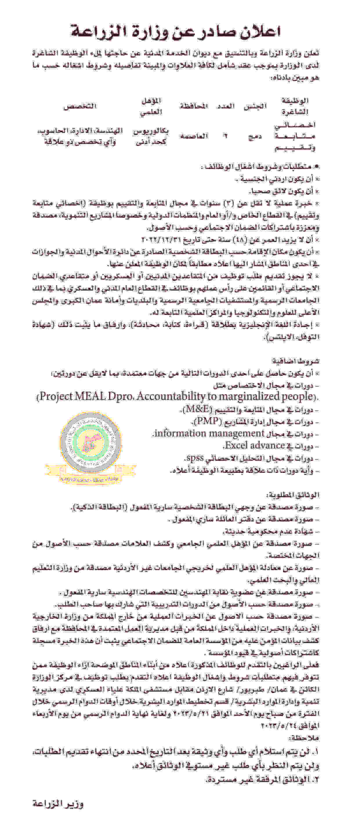 اعلان وظائف شاغرة بموجب عقد شامل لكافة العلاوات صادرعن وزارة الزراعة