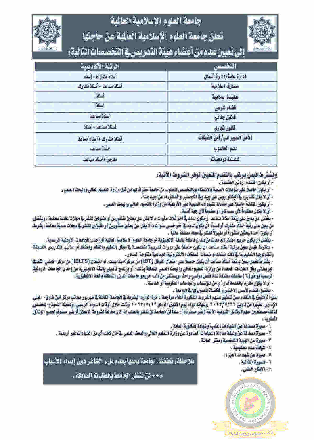 اعلان تعيين اعضاء هيئة تدريسية صادر عن جامعة العلوم الإسلامية العالمية