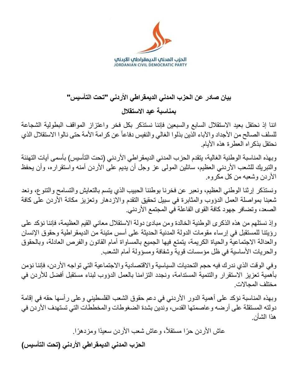 وبهذه المناسبة الوطنية الغالية، يتقدم الحزب المدني الديمقراطي الأردني (تحت التأسيس) بأسمى آيات التهنئة والتبريك للشعب الأردني العظيم، سائلين المولى عز وجل أن يديم على الأردن أمنه واستقراره، وأن يحفظ الأردن وشعبه من كل مكروه.