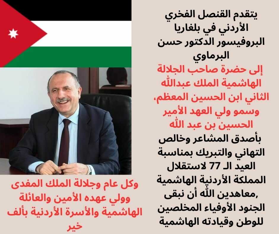 باصدق المشاعر وخالص التبريك بمناسبة العيد 77 لاستقلال المملكة الاردنية الهاشمية
