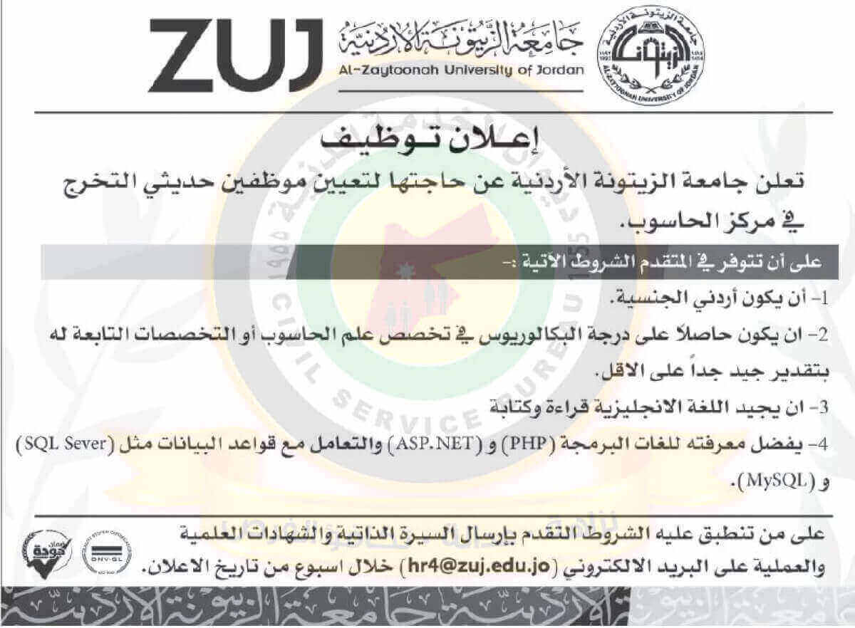 اعلان توفر وظائف شاغرة صادر عن جامعة الزيتونة الاردنية