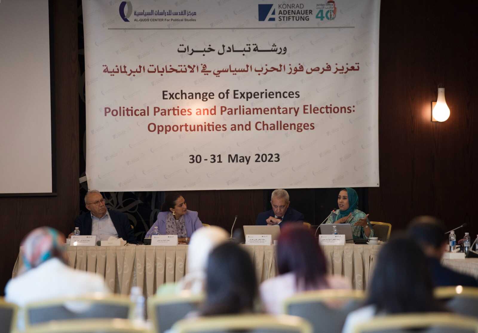 22 الاعلامي - نظم مركز القدس للدراسات السياسية ومؤسسة كونراد أديناور وبالتعاون مع الهيئة المستقلة للانتخابات، نهاية الأسبوع الفائت، ورشة "تبادل خبرات" بعنوان "تعزيز فرص الأحزاب السياسية في الانتخابات العامة"، شارك فيها قرابة 70 مشاركاً ومشاركة من الأمناء العامين وقادة الصف الأول في أكثر من عشرين حزباً مسجلاً بموجب قانون الأحزاب السياسية الجديد وخبراء من المغرب ولبنان.