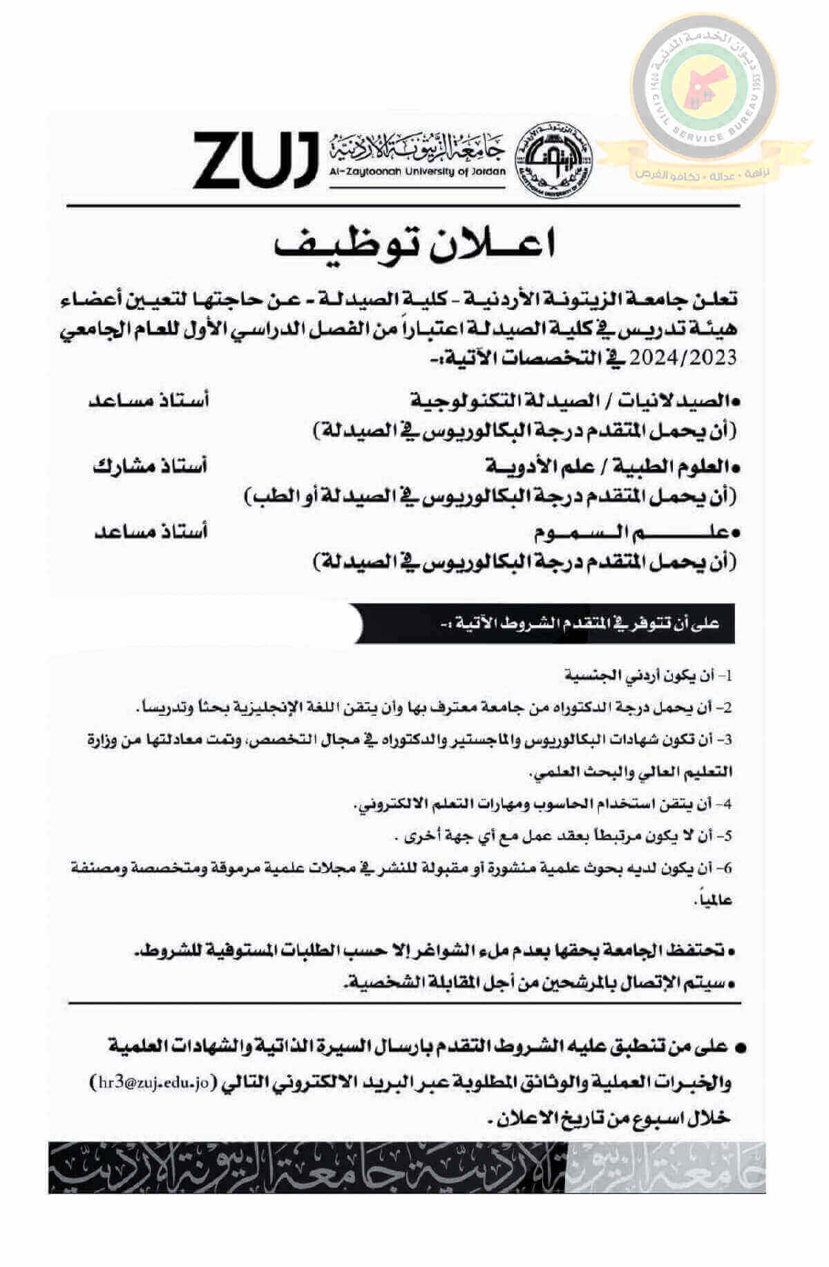 اعلان تعيين اعضاء هيئة تدريسية صادر عن جامعة الزيتونة الأردنية