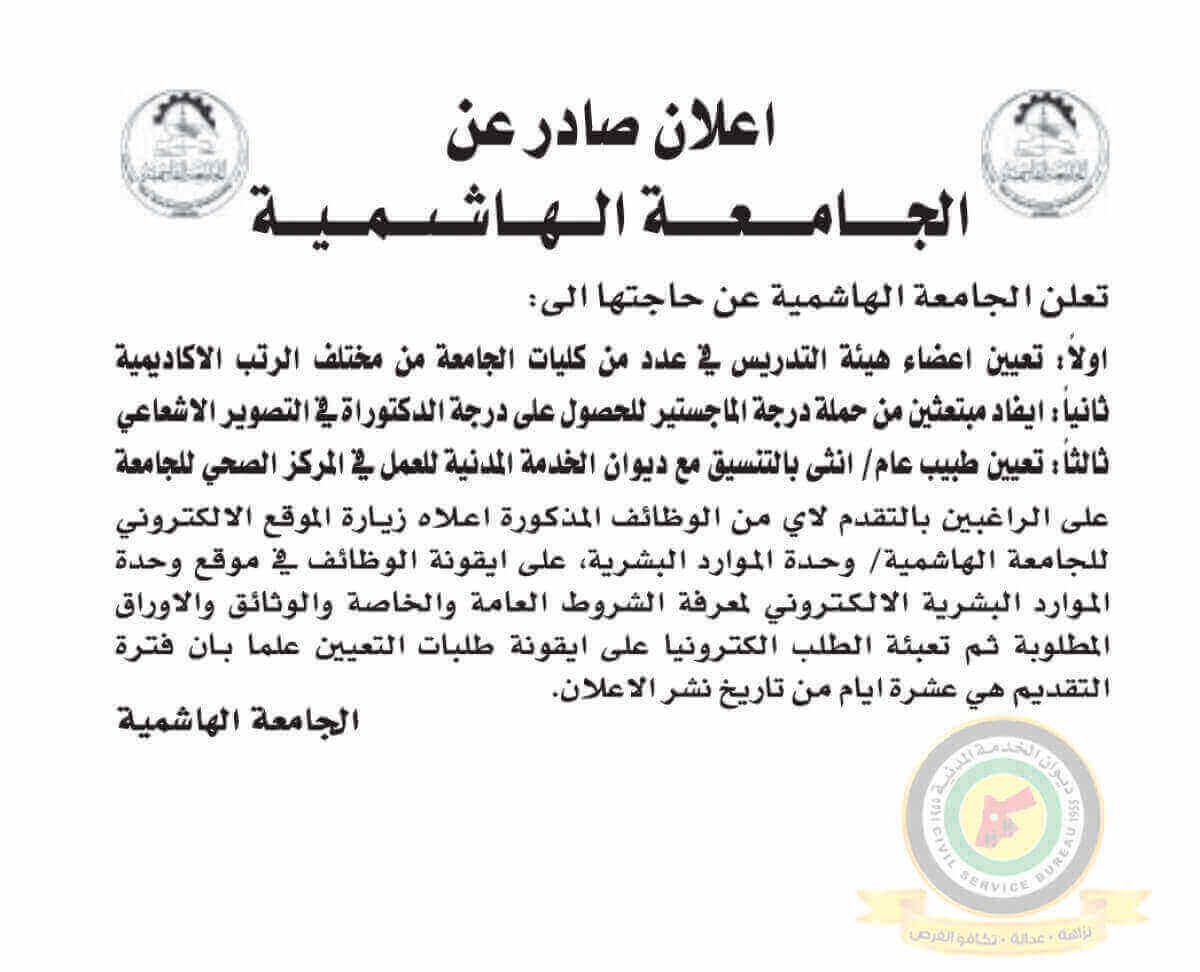 اعلان تعيين اعضاء هيئة تدريسية وطبيب صادر عن الجامعة الهاشمية