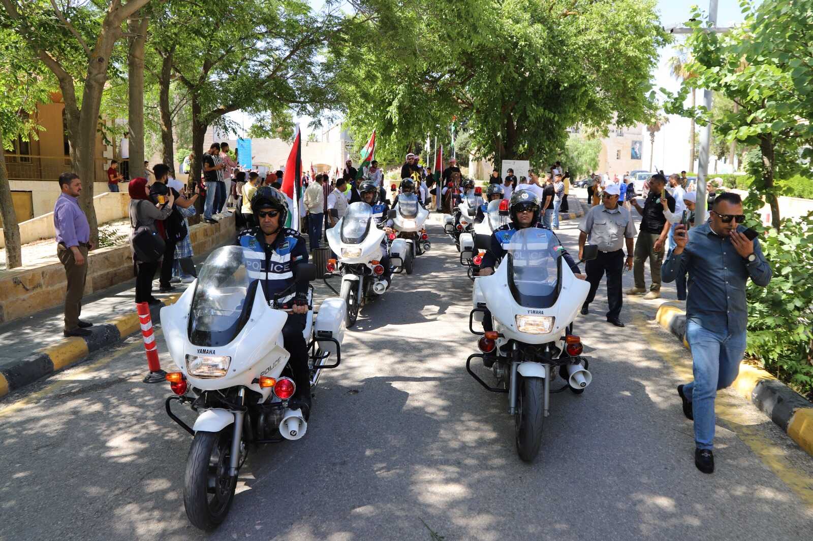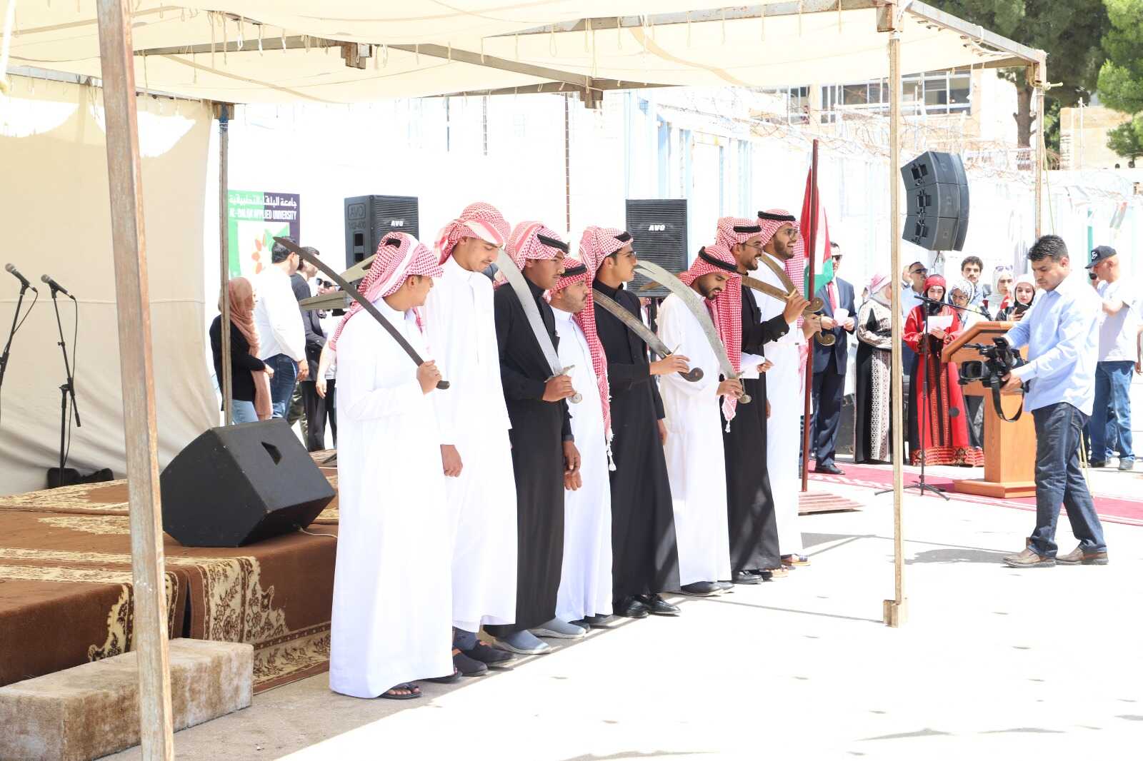 وكان الاحتفال قد بدأ بمسيرة انطلقت من امام رئاسة الجامعة يتقدمها رئيس الجامعة والحضور وشاركت فيها دراجات المعهد المروري وخيول من نادي قلعة السلط للفروسية ،رفع فيها المشاركون اعلام المملكة وصور جلالة الملك .