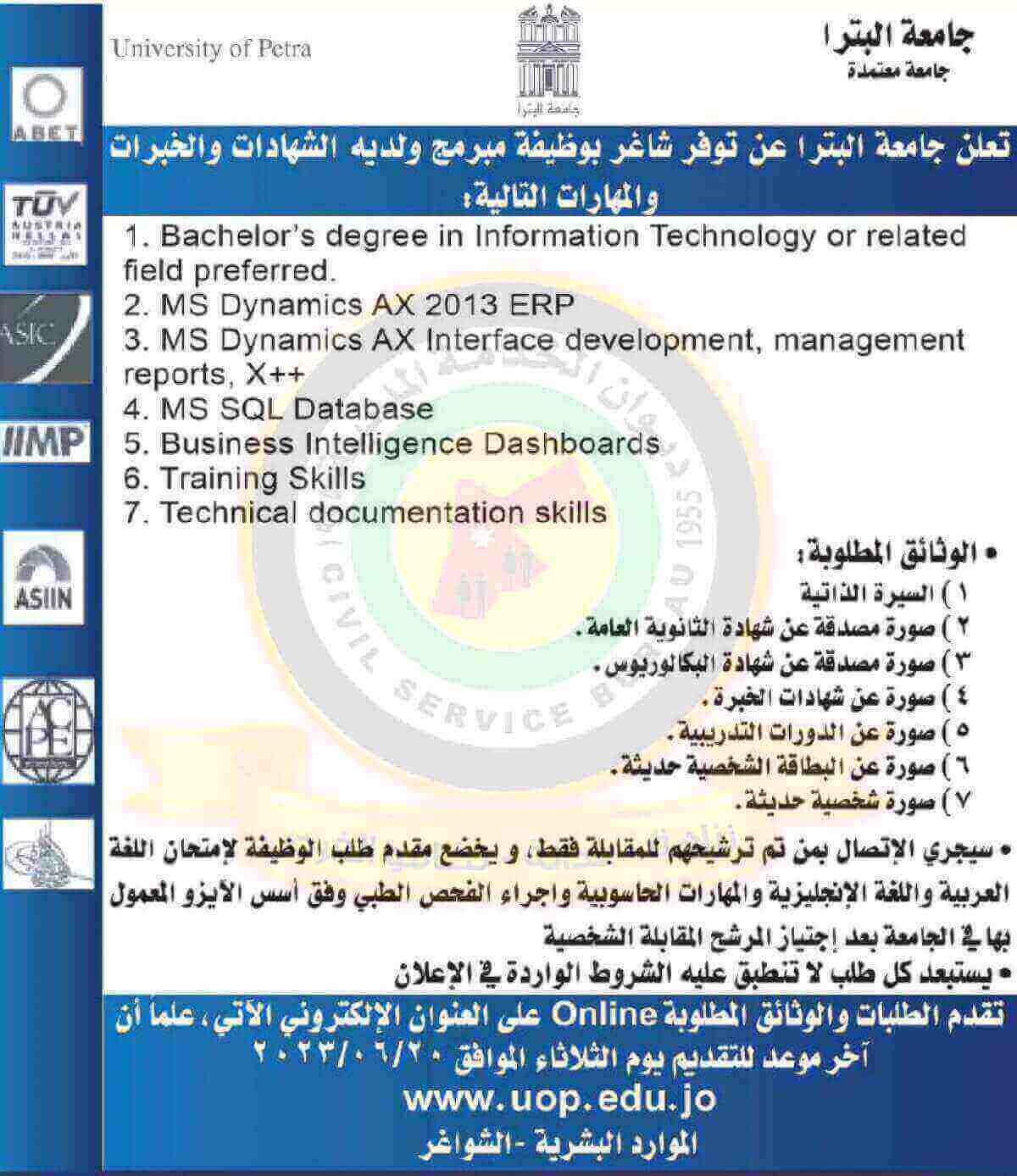 اعلان توفر شاغر مبرمج صادر عن جامعة البترا