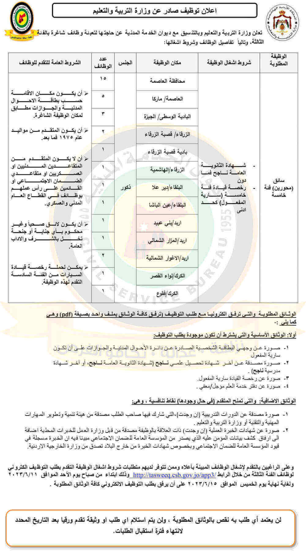 اعلان وظائف شاغرة صادر عن وزارة التربية والتعليم