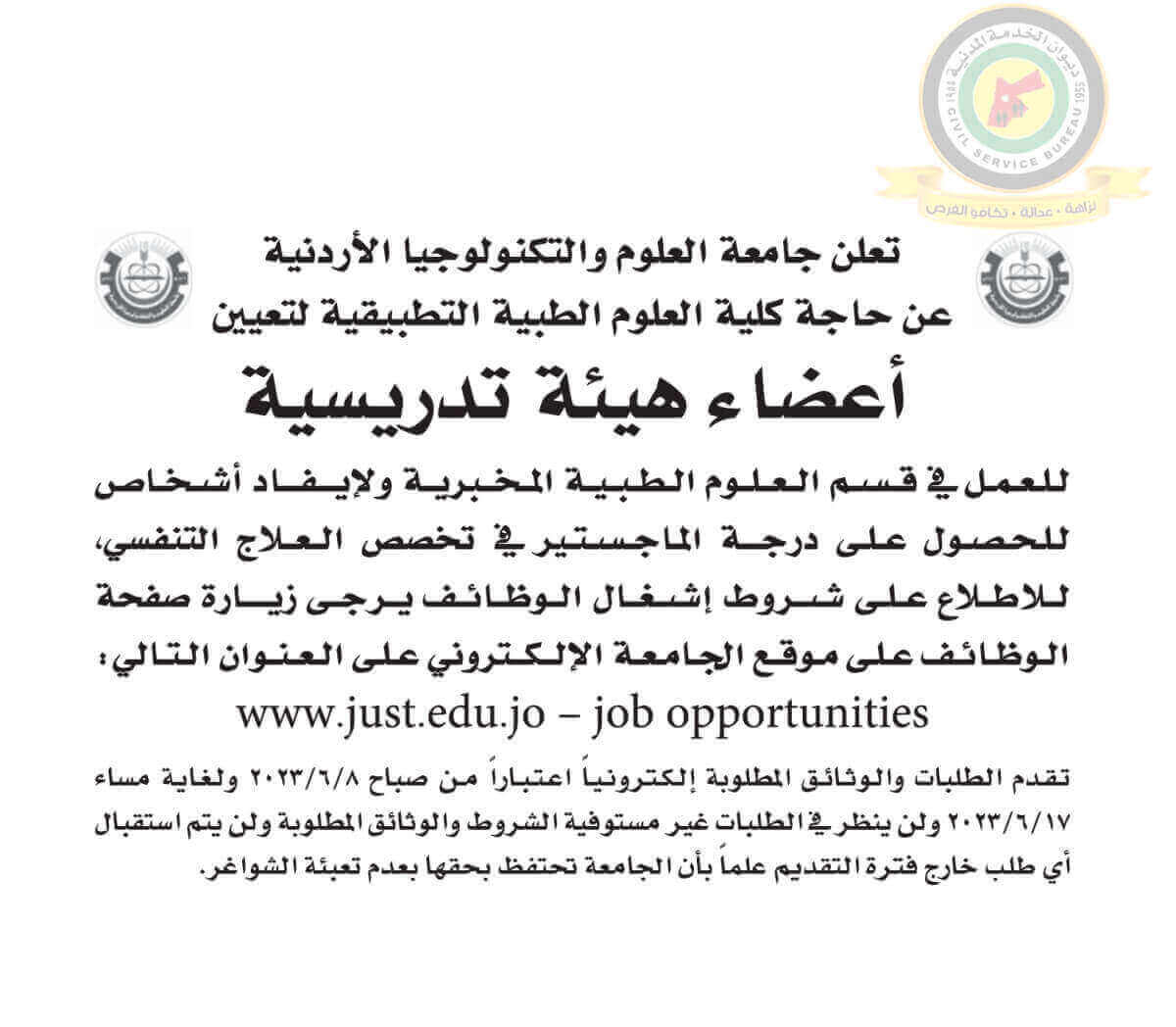 اعلان تعيين اعضاء هيئة تدريسية صادر عن جامعة العلوم والتكنولوجيا الأردنية