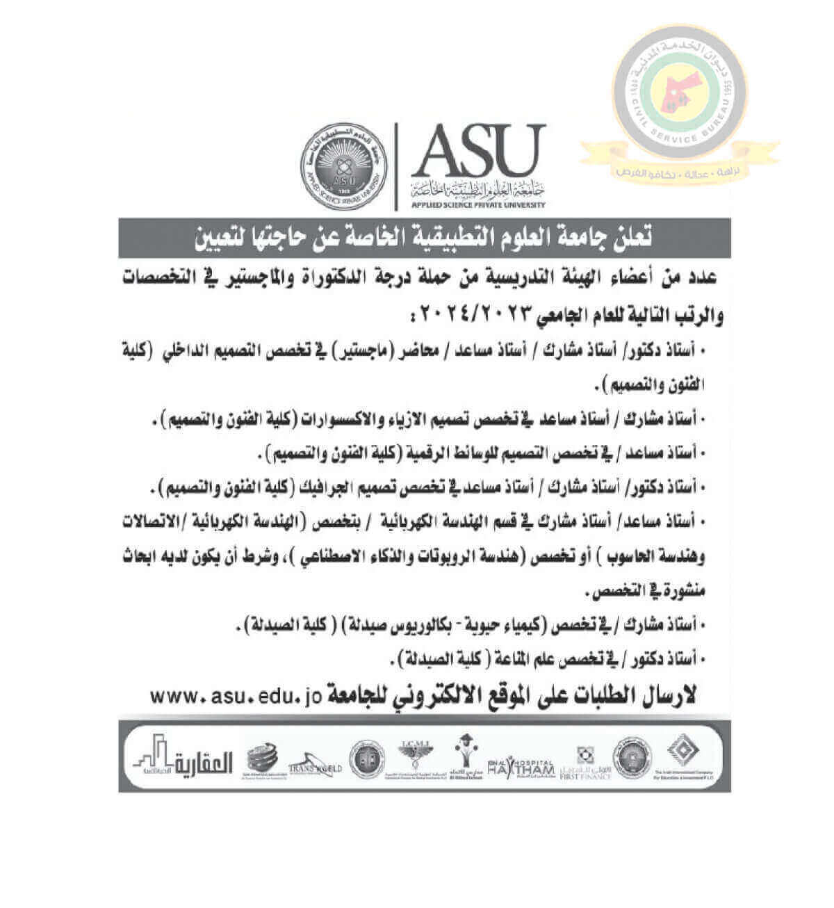 اعلان تعيين اعضاء هيئة تدريسية صادر عن جامعة العلوم التطبيقية