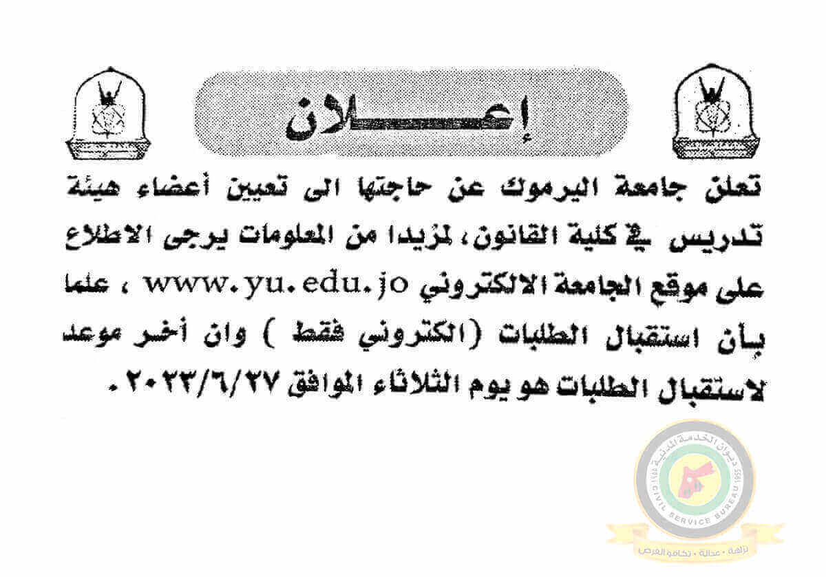 اعلان تعيين اعضاء هيئة تدريسية صادر عن جامعة اليرموك