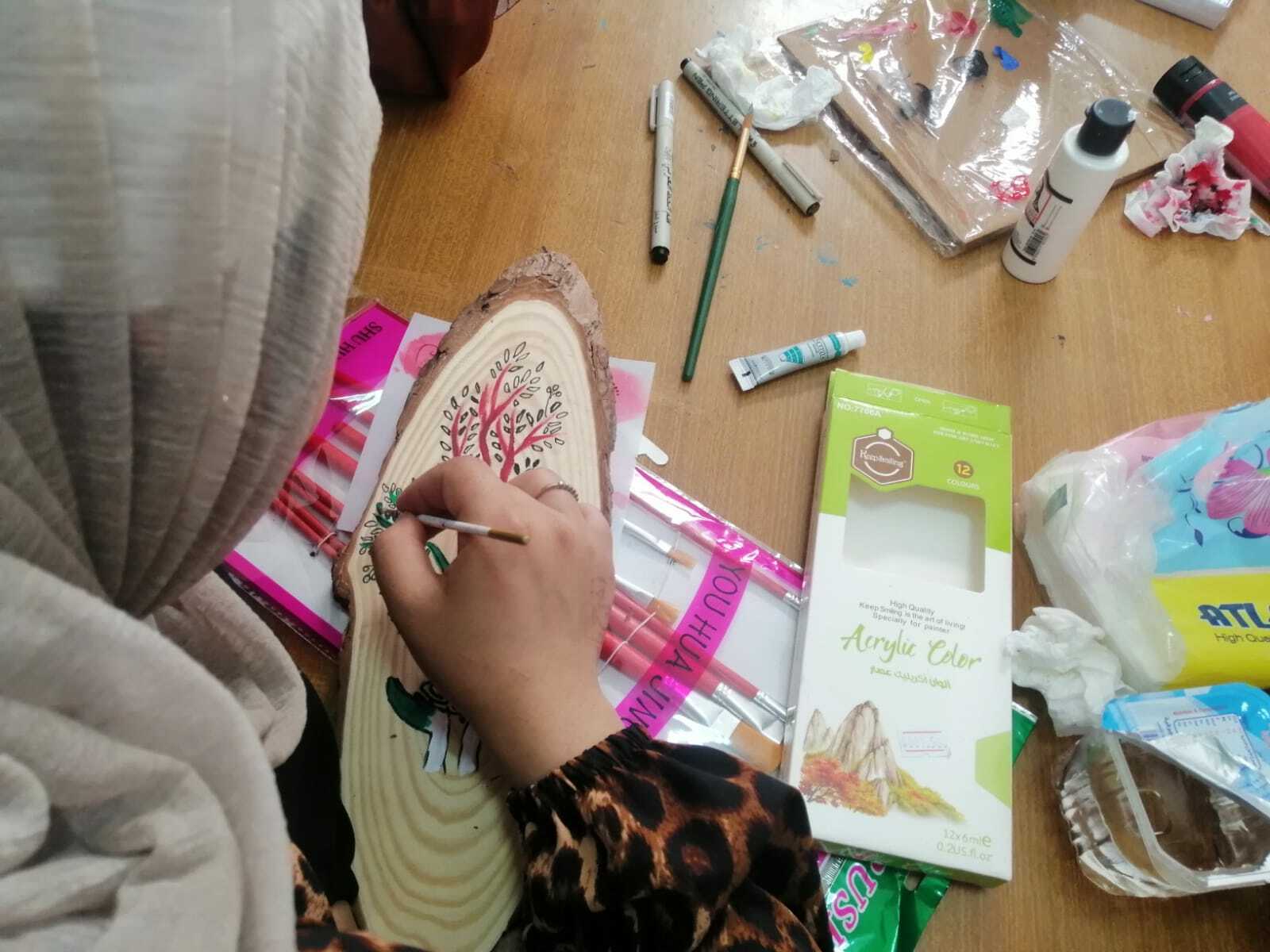 حيث قامت المدربه آلاء الفقيه بتدريب المشاركات على عملية دمج ألوان وإيجاد ألوان جديدة ضمن ألوان الأساسية المتواجده وكيفية تعلم الرسم من خلال تعلم أساسيات الرسم بشكل عام و والتعريف بأنواع الخشب وكيفية اختيار الخشب الملائم للرسم.