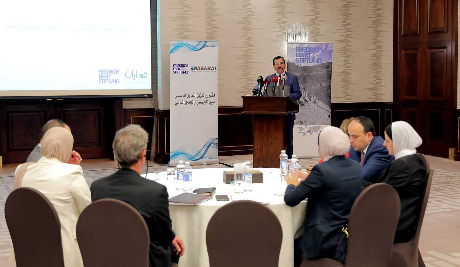 عقدت مؤسسة مسارات الأردنية للتنمية والتطوير، بالتعاون مع مؤسسة فريدريش ابيرت-الأردن، اليوم الأحد، مؤتمر إطلاق مشروع "تعزيز التعاون المؤسسي بين البرلمان والمجتمع المدني".