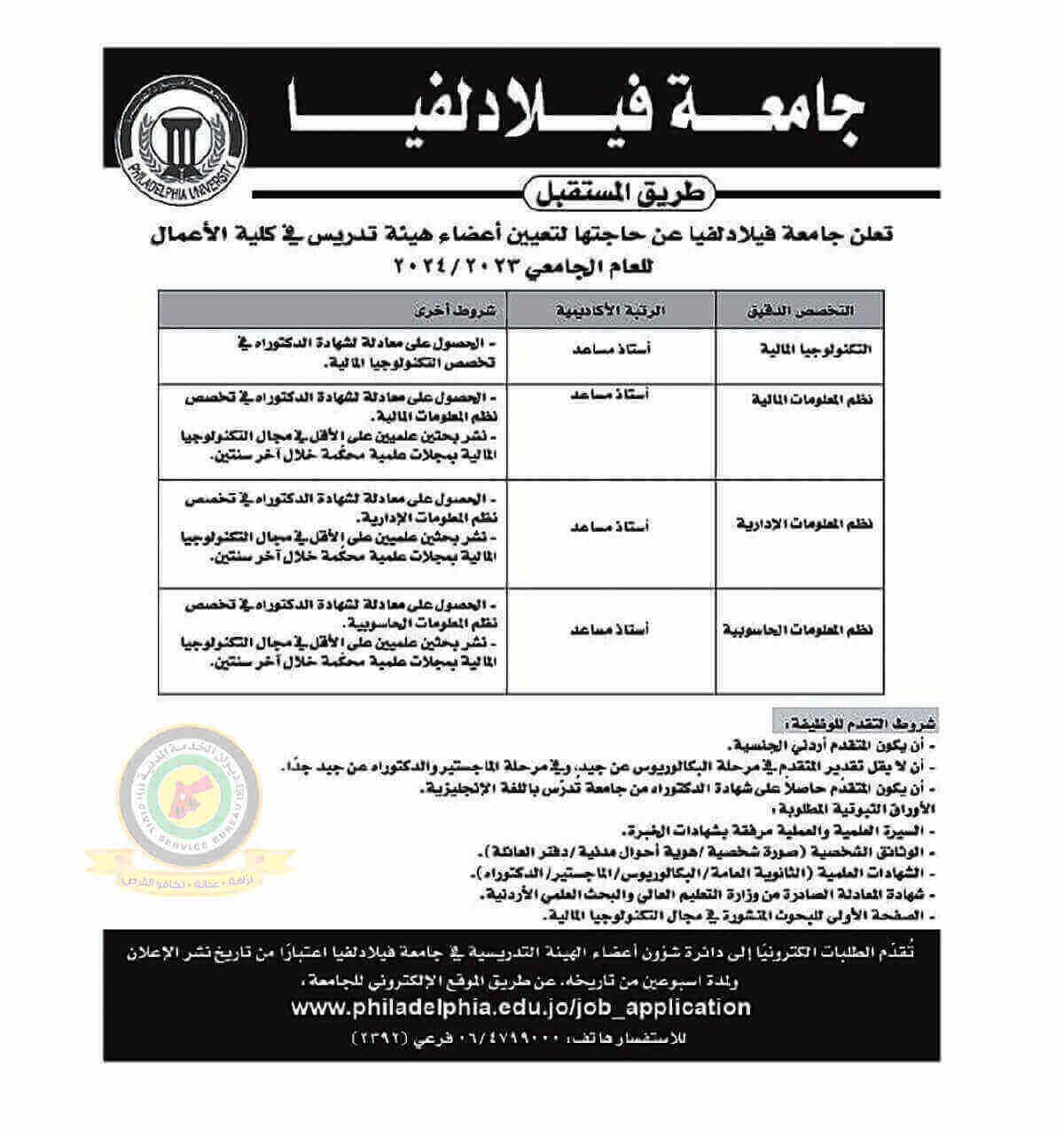 اعلان تعيين اعضاء هيئة تدريسية صادر عن جامعة فيلادلفيا - كلية الأعمال