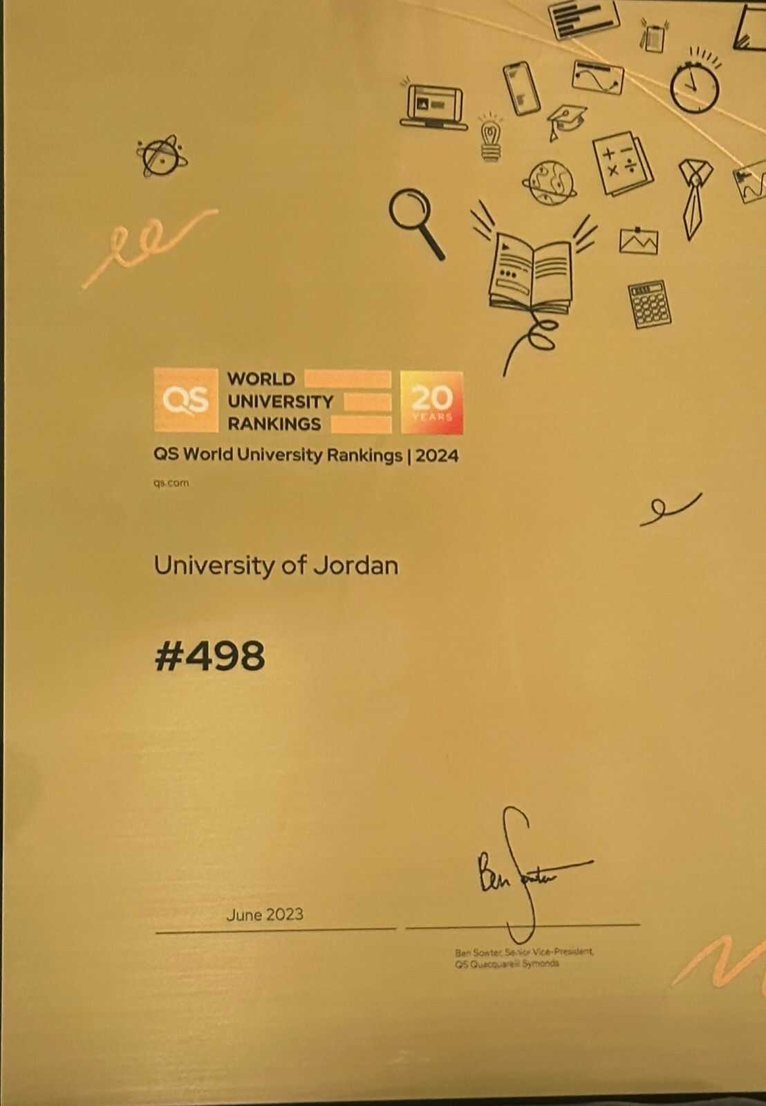 22 الاعلامي - أخبار الجامعة الأردنية ( أ ج أ) زكريا الغول - بعد جهود مضنية، استمرت لأزيد من عشر سنوات، حلت الجامعة الأردنية في المرتبة 498 ضمن أفضل 500 جامعة في العالم رسميا وفق تصنيف QS العالمي 2024.