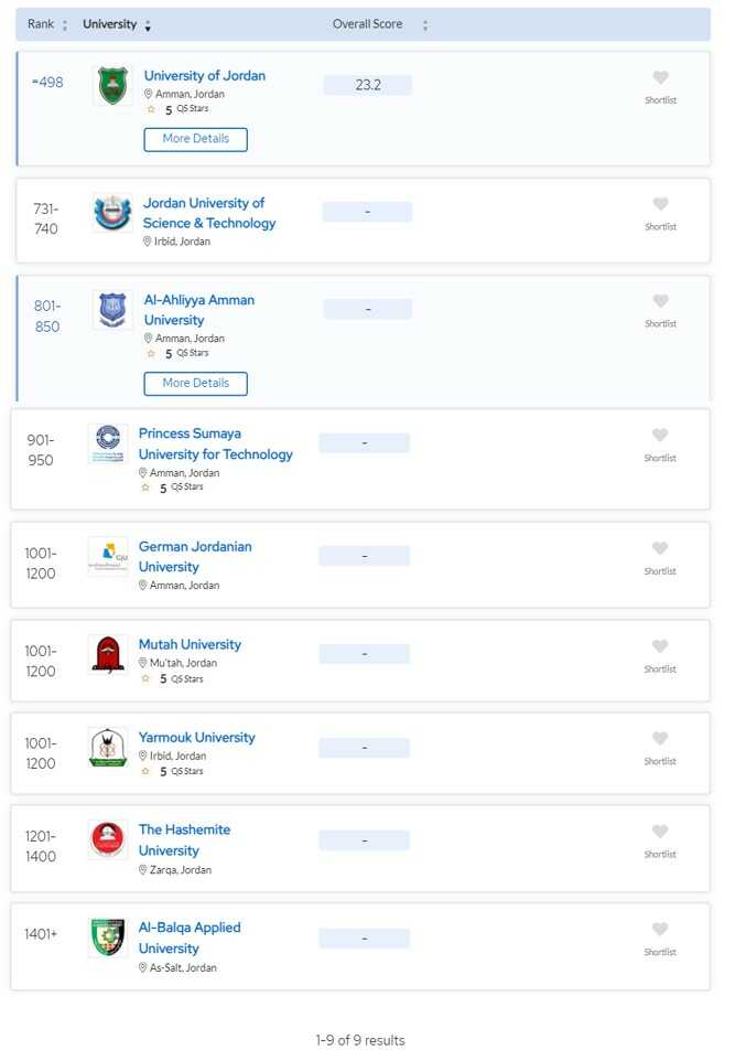 وتلا الجامعة الأردنية في تصنيف QS العالمي 2024 جامعة العلوم والتكنولوجيا في المرتبة (731-740) ثم جامعة عمان الأهلية في المرتبة (801-850) وحامعة الأميرة سمية في المرتبة (901-950) تليها كل من جامعة مؤتة وجامعة اليرموك والجامعة الألمانية الأردنية في المرتبة (1001-1200)، بينما جاءت الجامعة الهاشمية في المرتبة (1201-1400) وأخيرا جامعة البلقاء التطبيقية في المرتبة (1401+)، أما بقية الجامعات لم تحقق معايير التصنيف بعد.