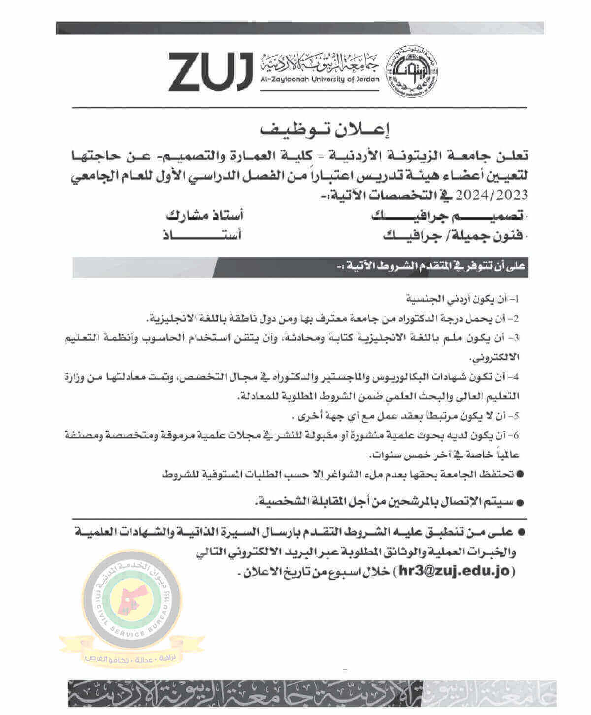 اعلان تعيين اعضاء هيئة تدريسية صادر عن جامعة الزيتونة الأردنية - كلية العمارة والتصميم