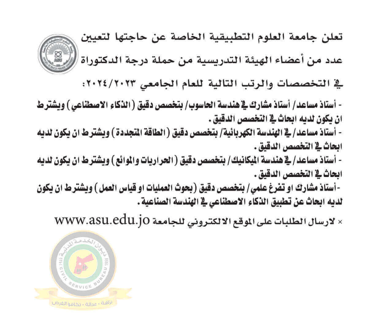 اعلان تعيين اعضاء هيئة تدريسية صادر عن جامعة العلوم التطبيقية
